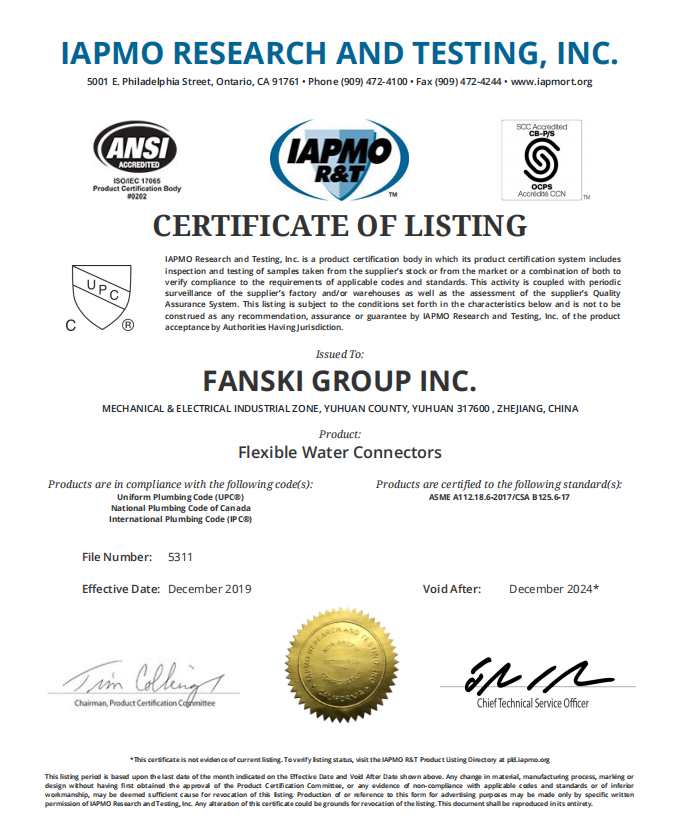 The mateirals of the flexible connectors are made of lead free brass parts and hygeian inner tubes, it's suitable for potable water system.